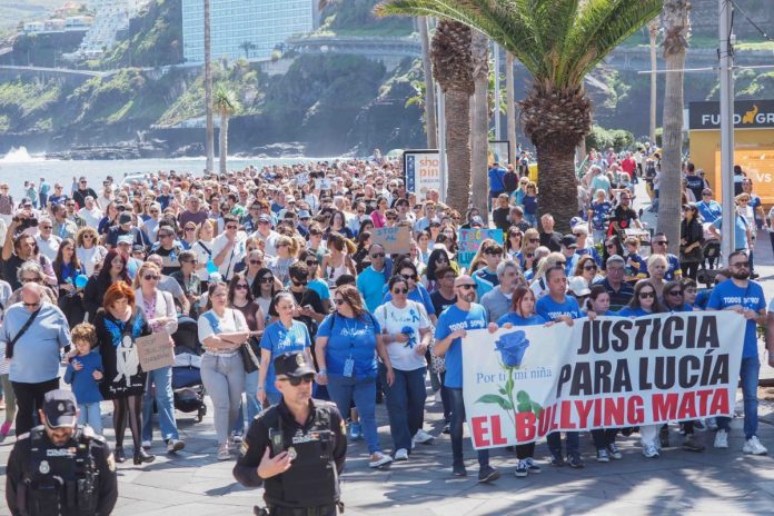 Encabezando la manifestación, una pancarta con el lema Justicia para Lucía, el Bullying Mata fue sostenida por los padres de la menor, Quico y Laura, junto a sus hijas Sara y Elisa. Tras ellos, cientos de familias, vecinos y representantes de asociaciones sociales caminaron en respetuoso silencio hasta el Muelle, acompañados por autoridades locales como el alcalde de Puerto de la Cruz, Leopoldo Afonso.