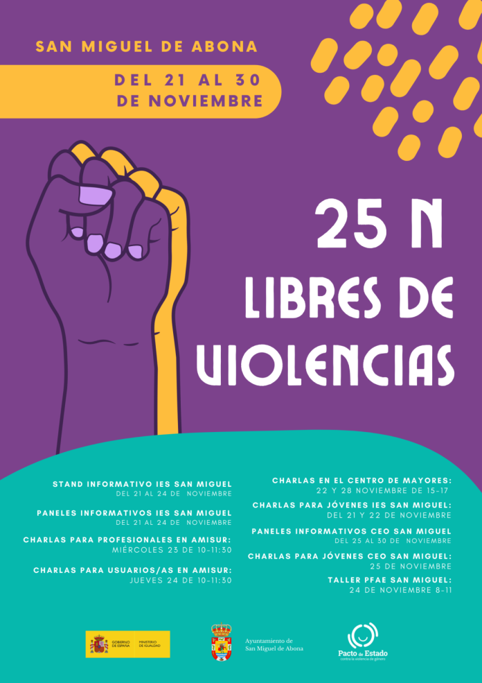 El Ayuntamiento de San Miguel de Abona, a través de la concejalía de Igualdad, sigue reivindicando una fecha tan señalada como es el 25 de noviembre, Día Internacional de la Eliminación de la Violencia contra las Mujeres. Este año lo hace bajo el lema “25 N libres de violencias” y con un programa de actividades que entre el 21 y el 30 de noviembre y a través de los fondos del Pacto de Estado, se desarrollará en centros escolares del municipio, centros ocupacionales , centros de mayores y en instalaciones que alberguen los PFAE.