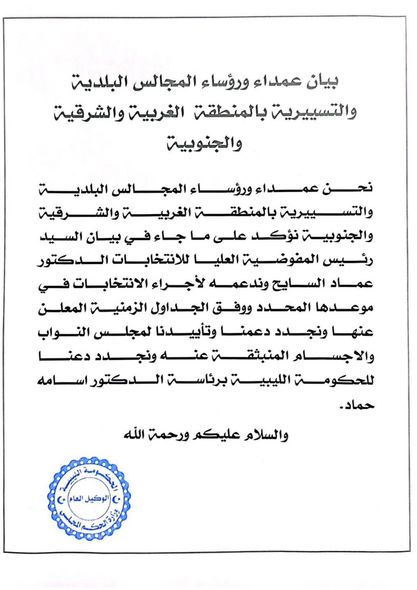 Un comunicado conjunto firmado por 98 alcaldes y presidentes de concejos municipales de las regiones este, sur y oeste de Libia ha reafirmado su total apoyo al Presidente del Consejo de la Alta Comisión Nacional para Elecciones, Dr. Emad Al-Saeh, y ha expresado su firme respaldo a la celebración de las elecciones municipales en la fecha previamente establecida. Los líderes locales también renovaron su respaldo a la Cámara de Representantes y a las instituciones derivadas de ella, destacando su papel esencial en la estabilidad política y el fortalecimiento de la democracia en Libia.