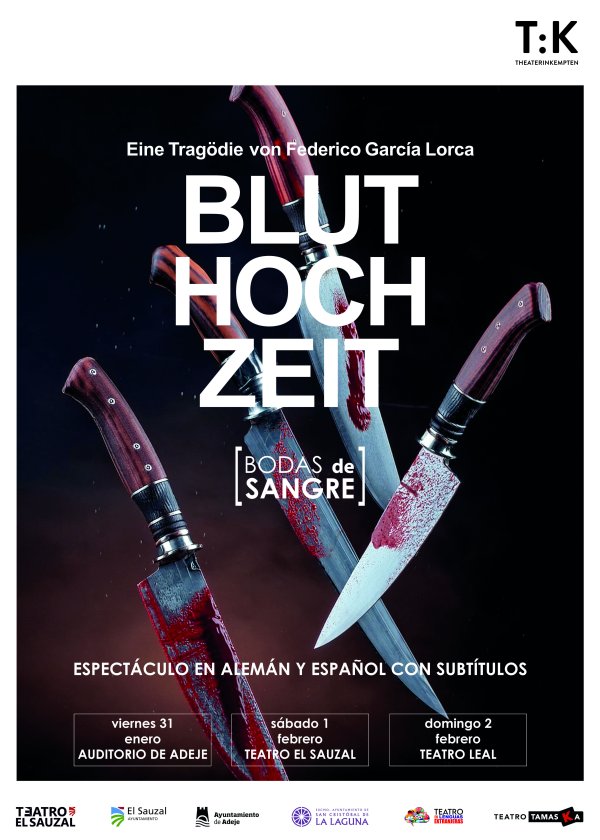 Bluthochzeit se estrenó en Kempten el 23 de octubre del 24, permaneciendo en cartel hasta el 3 de noviembre. Se representará en tres ciudades diferentes de Tenerife en enero de 2025: en el Teatro El Sauzal, en Adeje y en la tradicional ciu- dad universitaria de La Laguna. Mientras que en alemania los pasajes del texto en español están subtitulados en alemán, en las representaciones de Tenerife se proyectarán sobretítulos en español para las escenas en alemán y viceversa.