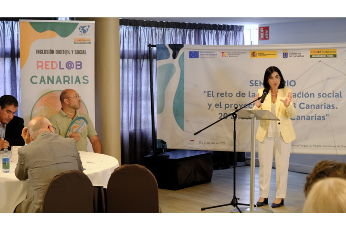 Las Palmas de Gran Canaria, jueves 20 de julio de 2023.- La alcaldesa de Las Palmas de Gran Canaria, Carolina Darias, ha participado este jueves en el seminario que, bajo el título ‘El Reto de la Digitalización Social y el Proyecto Redl@b Canarias. 20 años de EAPN Canarias’, se desarrolla en la capital entre hoy y mañana, subrayando el compromiso del Ayuntamiento capitalino para reducir la brecha digital y reforzar la autonomía de las personas, especialmente de las más vulnerables.