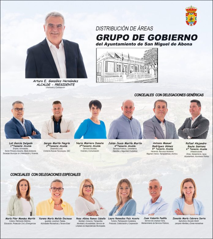 “La ciudadanía eligió el pasado 28 de mayo y San Miguel de Abona seguirá siendo para nosotros un reto continuo, un pueblo que no parará de avanzar con equipo de hombres y mujeres que darán lo mejor para seguir mejorando su calidad de vida. Un equipo entusiasta, con empuje y comprometido con las verdaderas necesidades municipales”, señala el alcalde, Arturo González.