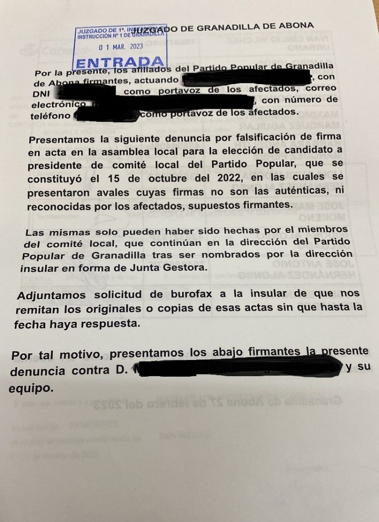 Un grupo de afiliados del Partido Popular en Granadilla de Abona han presentado una denuncia colectiva en los juzgados de la localidad por un supuesto fraude en las primarias del partido para elegir al nuevo presidente local. Los denunciantes aseguran que se han falsificado avales para que el actual presidente, Marcos Antonio Rodríguez, obtuviera el apoyo necesario para revalidar su cargo. Además, denuncian que tanto el PP en Canarias, como el presidente en la isla de Tenerife del PP, Emilio Navarro, podrían ser conscientes de los hechos y no han tomado ninguna medida al respecto, e incluso estarían postulando al supuesto infractor como candidato a las próximas elecciones municipales.