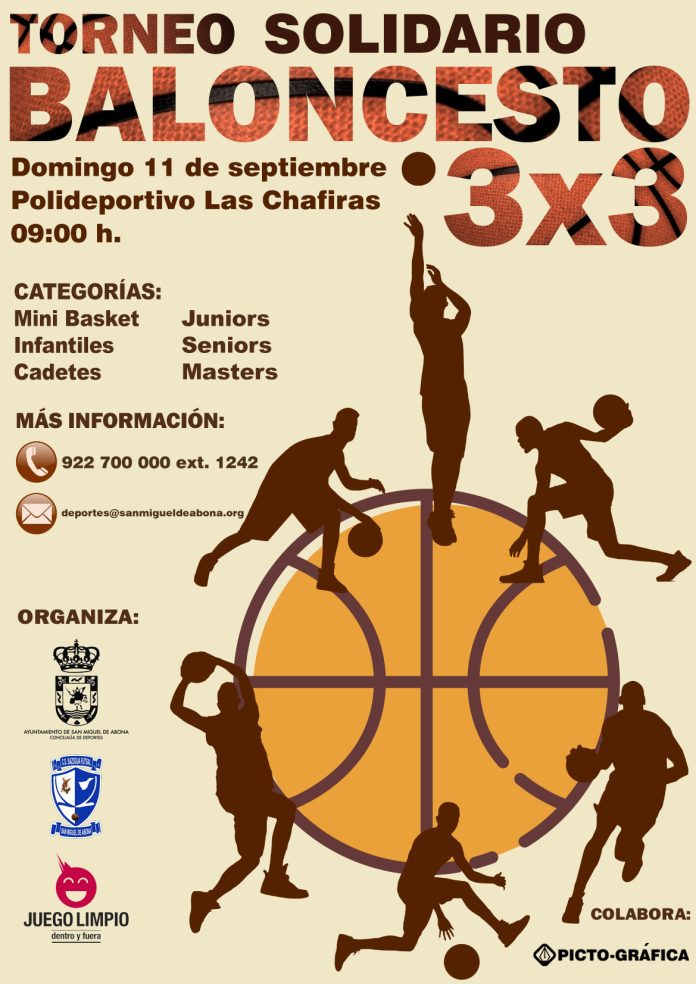 El Ayuntamiento de San Miguel de Abona, a través de la Concejalía de Deportes, y dentro de los numerosos actos programados con motivo de las Fiestas Patronales, organiza un torneo Solidario 3×3 Baloncesto en Las Chafiras. El Polideportivo de este núcleo sanmiguelero acogerá el próximo domingo 11 de septiembre, a partir de las 09.00 h, esta iniciativa en la que los equipos inscritos podrán disfrutar de un gran día de baloncesto.