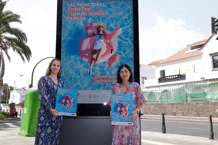 Las Palmas de Gran Canaria, martes 8 de agosto de 2023.- La alcaldesa de Las Palmas de Gran Canaria, Carolina Darias, y la presidenta Instituto Canario de Hemodonación y Hemoterapia (ICHH), dependiente de la Consejería de Sanidad del Gobierno de Canarias, Gemma Torres, han presentado esta mañana la campaña de donación de sangre que lucirá en el mobiliario urbano municipal este verano.