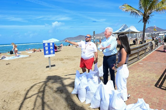 Como medida preventiva los operarios han colocado sacos de arena en todo el perímetro del balneario para mitigar la llegada del mar en las próximas pleamares ya que se espera que las condiciones de fuerte oleaje continúen.