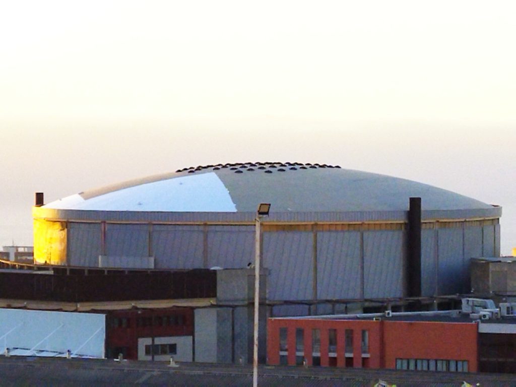 En estos momentos se está acometiendo en la renovación integral de la lámina que recubre el exterior de la cubierta empezando por el lateral noroeste y, paralelamente, se ejecutan otras mejoras como la distribución eléctrica que alimentará el nuevo sistema motorizado de lamas de aluminio que facilitará el oscurecimiento del espacio y que se controlará desde el interior.