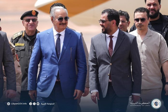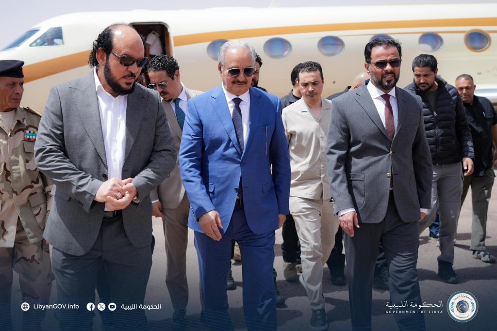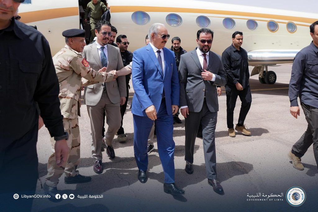 El sol del desierto aún brillaba con fuerza sobre la pista del aeropuerto de Sabha cuando el avión que transportaba al Mariscal de Guerra Khalifa Abu Alqasem Haftar tocó tierra. El Comandante en Jefe de las Fuerzas Armadas Libias fue recibido con honores por una delegación de alto nivel, encabezada por el Primer Ministro, Dr. Osama Hamad, el Viceprimer Ministro, miembros del gabinete, así como por el Director del Fondo de Desarrollo y Reconstrucción de Libia, el ingeniero Belqasem Haftar, y varios líderes militares y de seguridad.