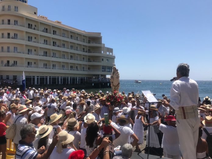 Este acto se iniciará aproximadamente a las 13.00 horas, tras la misa, donde habrá ofrenda solidaria a la Virgen, y cuyos productos serán distribuidos por Cáritas. En este evento participarán los bailarines de El Pinar (El Hierro), la banda de Agaete y diversos grupos folclóricos, finalizándose con la embarcación y un paseo por la bahía de este núcleo costero, y donde participarán con su voz, los cantantes Juan Antonio ‘El Charro’ y Jessica Dorta. La jornada del domingo concluirá con verbena por parte del grupo Kimbara y las orquestas Wamampy, Malibú Band y Tropin.