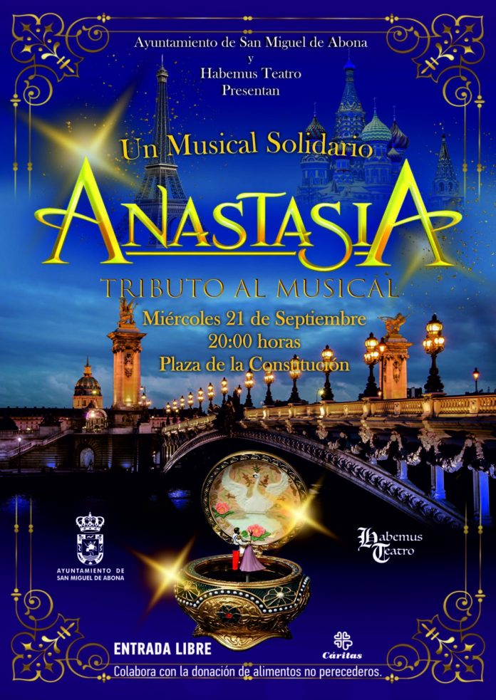 Con motivo de las Fiestas Patronales, San Miguel de Abona abre sus puertas para recibir el Musical ”Anastasia” (Tributo). Un espectáculo que, de acceso libre hasta completar aforo, tendrá lugar el próximo 21 de septiembre a partir de las 20:00 h. en la Plaza de la Constitución. En la entrada al mismo podrás además colaborar, de forma voluntaria, con la entrega de alimentos no perecederos que serán destinados a personas con escasos recursos del municipio.