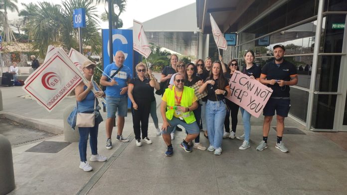 El personal en Huelga se ha distribuido en diferentes concentraciones a lo largo de la entrada de la terminal del Aeropuerto Tenerife Sur coreando consignas contra la actitud de la empresa y la defensa de su convenio, repartiendo octavillas a los turistas en diferentes idiomas denunciando la situación que atraviesan y explicando sus justas reivindicaciones.