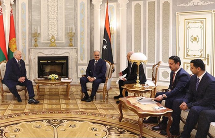 Haftar se reunió con el presidente bielorruso en la capital, Minsk, como parte de una visita que comenzó el lunes, según la Agencia de Telégrafos de Bielorrusia. Haftar dijo que Libia busca establecer una cooperación estratégica con Bielorrusia y destacó «el desarrollo que ha logrado en varios sectores, incluida la producción de maquinaria industrial y agrícola».