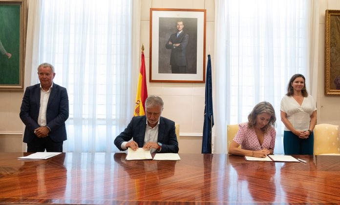 El presidente de Canarias, Ángel Víctor Torres, rubricó en la sede del ministerio de Transportes, Movilidad y Agenda Urbana (Mitma), y junto a la ministra del ramo, Raquel Sánchez, el protocolo de colaboración para coordinar la aplicación de la ampliación de las medidas transitorias de ayudas al transporte público regular y terrestre en las islas.