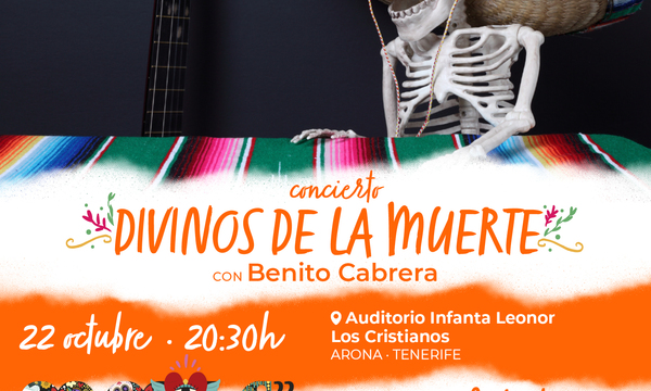 En el espectáculo Divinos de la Muerte, el timplista Benito Cabrera, acompañado de una banda de músicos, realizará un viaje hacia los ritos funerarios de diferentes culturales, como México, Cuba o Canarias. Se trata de un concierto realizado, de forma especial, para la decimonovena edición del Festival de Músicas Mestizas y + (MUMES), que cuenta con el lema Un festival de otro mundo, que propone un viaje musical entretenido, en el que se incluirán canciones que abordan el tema de la muerte desde una perspectiva irónica y desenfadada, como la célebre Don Gato o diversos estribillos de isa (“No me mates con tomate”), junto a composiciones clásicas vinculadas a los ritos funerarios de varios países.