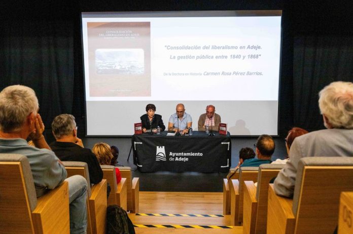 La Doctora en historia, Carmen Rosa Pérez Barrios, presentó el pasado martes 30 de abril en Adeje su último libro, “La consolidación del Liberalismo en Adeje. La gestión pública entre 1840 y 1868″. El evento contó con la participación del catedrático de Historia de América de la Universidad de La Laguna, Manuel Hernández González, y del concejal responsable del Área de Buen Gobierno, Epifanio Díaz Hernández.