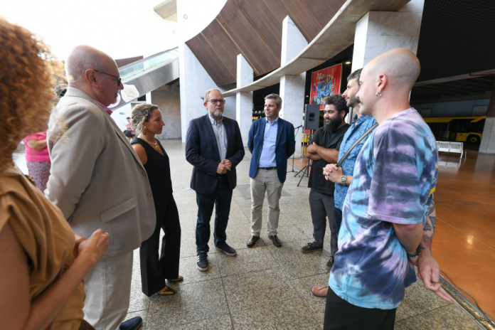 El presidente de Guaguas Municipales y concejal de Movilidad de Las Palmas de Gran Canaria, José Eduardo Ramírez y el gerente de la Autoridad Única del Transporte, Ruymán Santana, acompañados por el director general de Guaguas Municipales, Miguel Ángel Rodríguez, presentaron los trabajos en gran formato realizados por los artistas, que quedarán expuestas en este importante nodo de transporte de la ciudad.