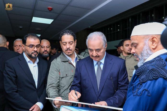 Field Marshal Khalifa Abul Qasim Haftar, Commander-in-Chief of the Libyan Armed Forces, made an official visit to the fourth edition of the Benghazi International Book Fair, accompanied by Libyan Prime Minister Dr. Osama Hamad.
