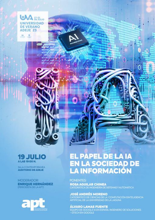 La Universidad de Verano de Adeje, coorganizada entre la Universidad de La Laguna y el ayuntamiento del municipio sureño, programa el debate ‘El papel de la Inteligencia Artificial en la sociedad de la información’, que bajo la organización de la Asociación de Periodistas de Santa Cruz de Tenerife (APT) tendrá lugar hoy miércoles 19 de julio, en la Sala Contemporánea del Auditorio de Adeje, a partir de las 19.00 horas, con entrada libre.