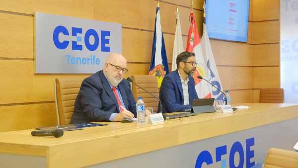 El presidente de la Confederación de Empresarios, Pedro Alfonso Martín, junto al director de consultoría José Miguel González Hernández, ha presentado el Informe de Coyuntura de Canarias para el tercer trimestre de 2022.