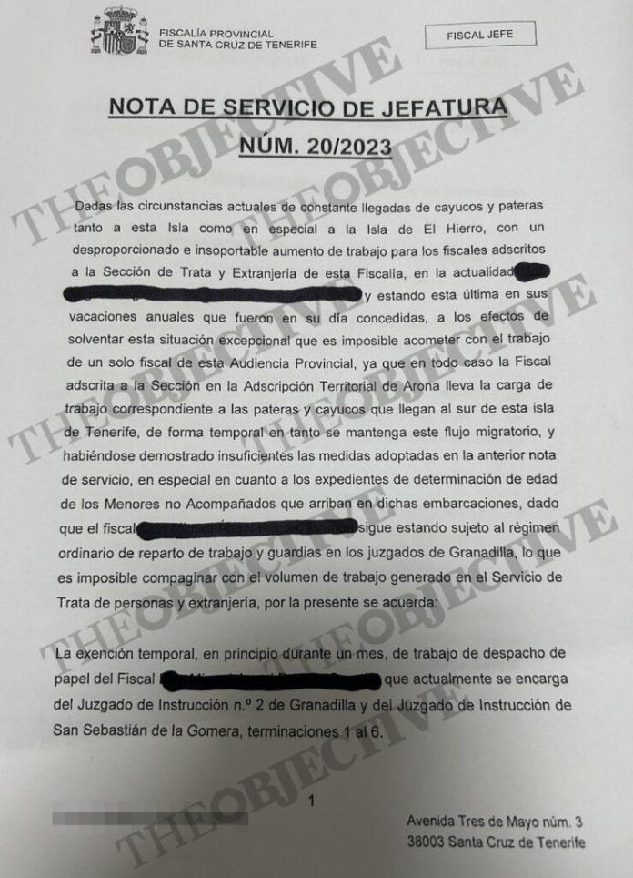 Nota interna del jefe de la Fiscalía Provincial de Tenerife ante la ola migratoria en El Hierro.