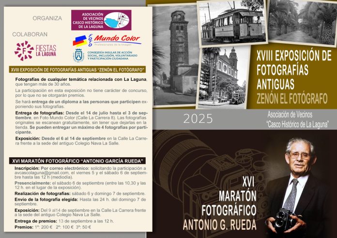 El ciudad de San Cristóbal de La Laguna se convertirá un año más en el escenario de una doble cita relacionada con el mundo de la fotografía, que servirá para dar a conocer los orígenes y los valores de este territorio catalogado como Patrimonio Histórico de la Humanidad por la UNESCO. A lo largo del mes de septiembre, se llevarán a cabo la XVIII Exposición de Fotografías Antiguas ‘Zenón el fotógrafo’ y el XVI Maratón Fotográfico ‘Antonio García Rueda’.