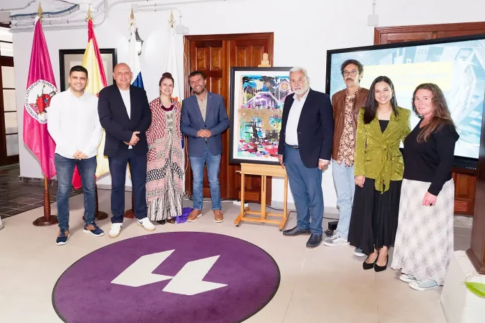 En el acto también intervino Jesús Ermelandro Pérez Guillen (Kichu), autor de la pintura que servirá como base para la imagen corporativa de esta Universidad de Verano de Adeje, que fue presentada en el acto de hoy. Este graduado en Bellas Artes por la Universidad de La Laguna es profesor de pintura en el Ayuntamiento de Adeje, y ha creado una imagen colorida que alude a la diversidad del municipio sureño, con el Roque del Conde ocupando el centro de la composición como gran icono que articula el resto de la pieza.