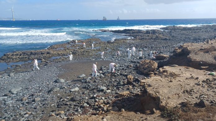 Las tareas de limpieza se están realizando de forma manual piedra a piedra, y se centran hoy viernes en el área que abarca la Playa de La Restinga hasta el Barranco del Real de Telde, la zona donde se ha producido la mayor concentración del vertido.