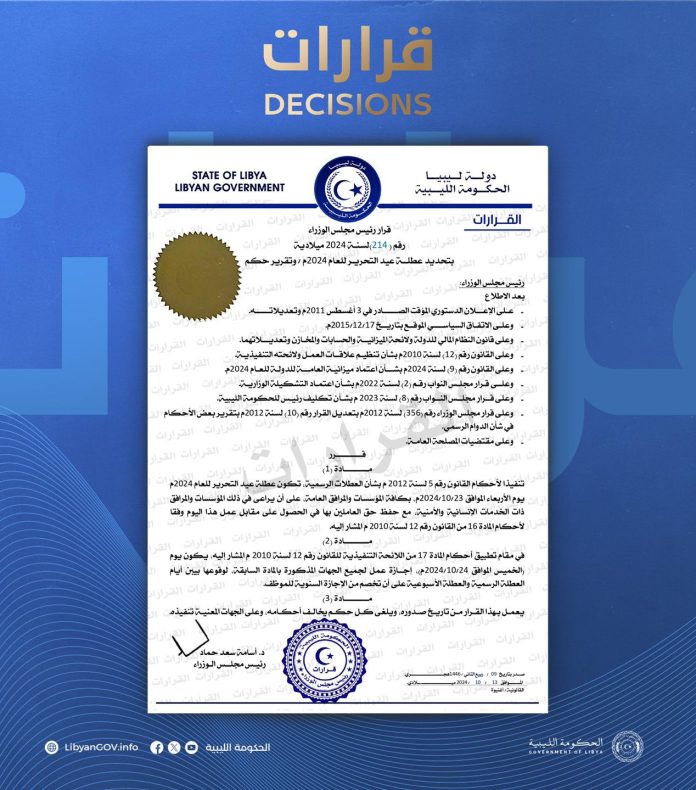 El Primer Ministro del Gabinete del Gobierno de Libia, Dr. Osama Hamad, ha emitido la Resolución No. 214 para el año 2024, en la que se declara el miércoles 23 de octubre como un día festivo en todo el país para conmemorar el Día de la Independencia de Libia. Esta jornada será de descanso obligatorio para todas las instituciones y organismos públicos, aunque las entidades cuya naturaleza lo exija podrán operar, ofreciendo compensación a los empleados que trabajen en este día festivo, según lo establecido por la legislación nacional.