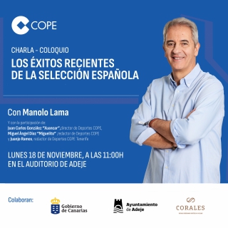 Hoy lunes 18 de noviembre, el prestigioso periodista deportivo Manolo Lama estará en el Auditorio de Adeje impartiendo la charla-coloquio “Los éxitos recientes de la Selección Española”. Este evento, que se celebrará a las 11:00 horas, hasta completar aforo, contará con la participación de grandes figuras del periodismo deportivo de la Cadena COPE además de Manolo Lama, Juan Carlos González “Xuancar”, Miguel Ángel Díaz “Miguelito” y Juanjo Ramos.