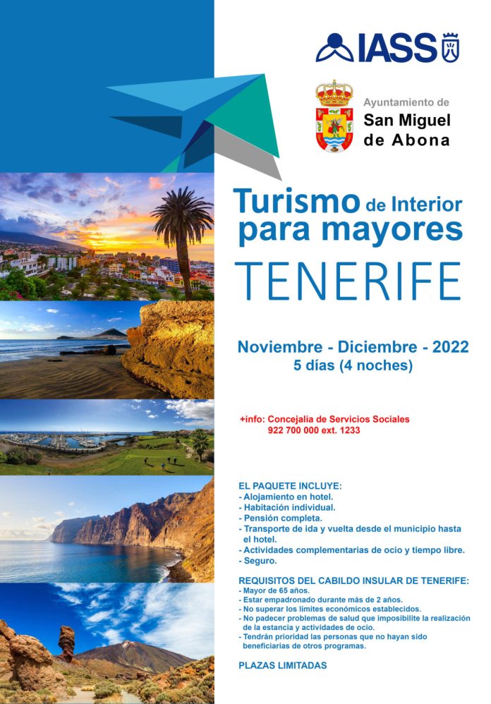 El proyecto de Turismo de Interior 2022, dirigido al colectivo de mayores, está previsto que se ponga en marcha a finales de noviembre. Por ello, el Ayuntamiento de San Miguel de Abona, a través del área de Servicios Sociales, ya está a disposición de informar a las personas del municipio interesadas en participar, de todos los requisitos que establece el Instituto de Asistencia Social y Sociosanitaria (IASS) del Cabildo Insular.