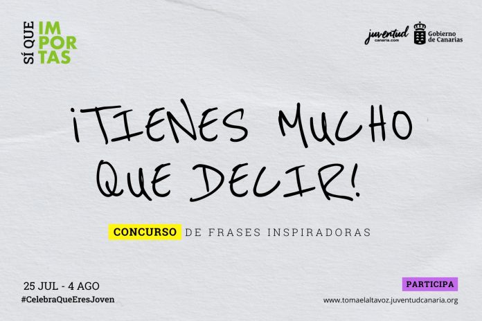 La Dirección General de Juventud del Gobierno de Canarias pone en marcha el concurso “Sí que importas, tienes mucho que decir” para buscar a jóvenes que protagonicen con sus frases y su imagen la campaña del Día Internacional de la Juventud que anualmente se festeja el 12 de agosto. El director general de Juventud, Daniel Morales, explica que a través de esta iniciativa, “el Gobierno de Canarias quiere dar el altavoz a la juventud para que exprese sus opiniones y su capacidad reflexiva para transformar nuestra sociedad.