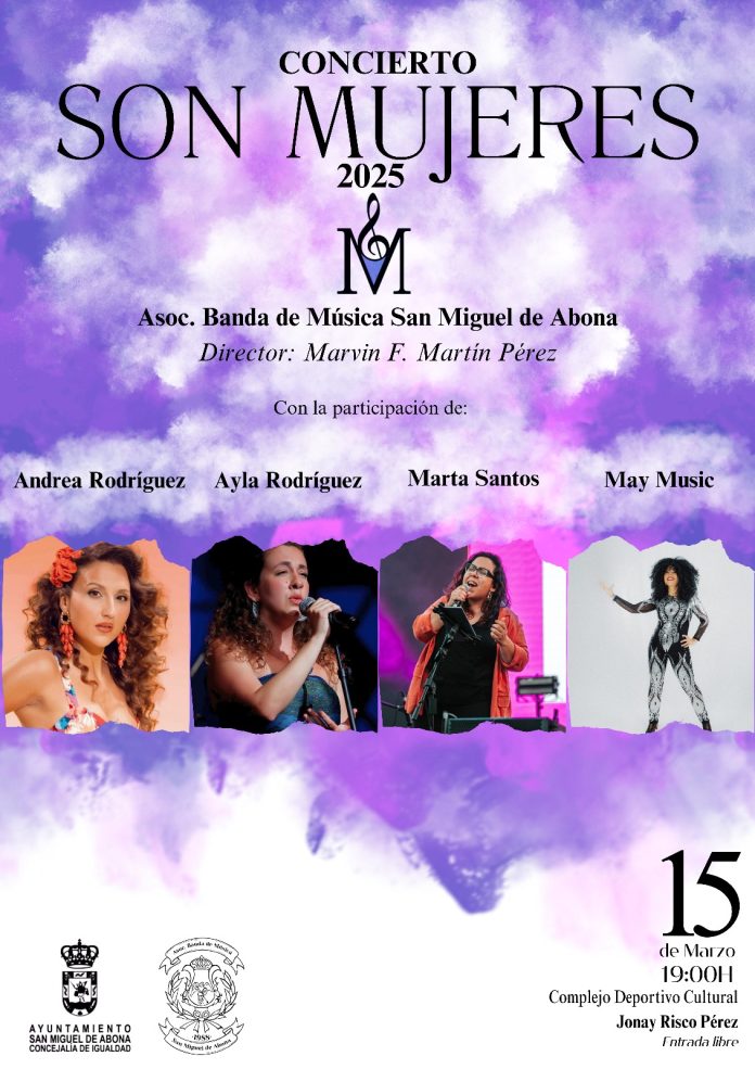 El Ayuntamiento de San Miguel de Abona, a través de la concejalía de Igualdad, sigue presentando su programación con motivo del 8M (Día Internacional de las Mujeres). En esta ocasión, el evento viene de la mano de la Banda de Música de San Miguel de Abona, Andrea Rodríguez, Ayla Rodríguez, Marta Santos y May Music, protagonistas del concierto SON MUJERES 2025.