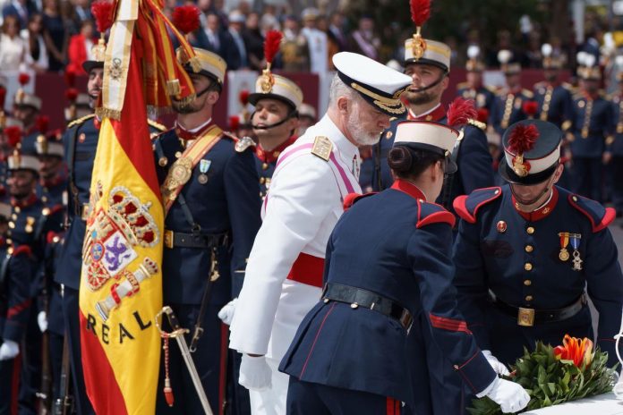 El acto comenzó con honores militares, el izado de la bandera y una salva de 21 cañonazos, seguida de un emocionante homenaje a los caídos por España. El ambiente fue solemne pero cercano, con miles de asistentes que no dudaron en corear vítores a los Reyes y mostrar banderas desde balcones engalanados.