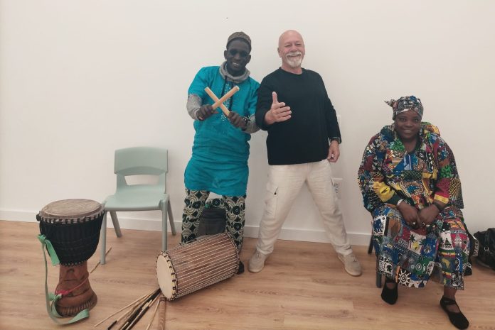 Madlen es el nombre de la super mujer que está en la foto adjunta y a mi derecha está Musa, el Rey de la percusión, un hombre que llegó a Canarias hace más de treinta años y viene de una familia de los mejores percusionistas de Senegal, actualmente vive en El Fraile.